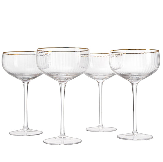 The Wine Savant - Gold Rim Coupe Champagne Glasses - (Ribbed) Set of 4 - 7oz